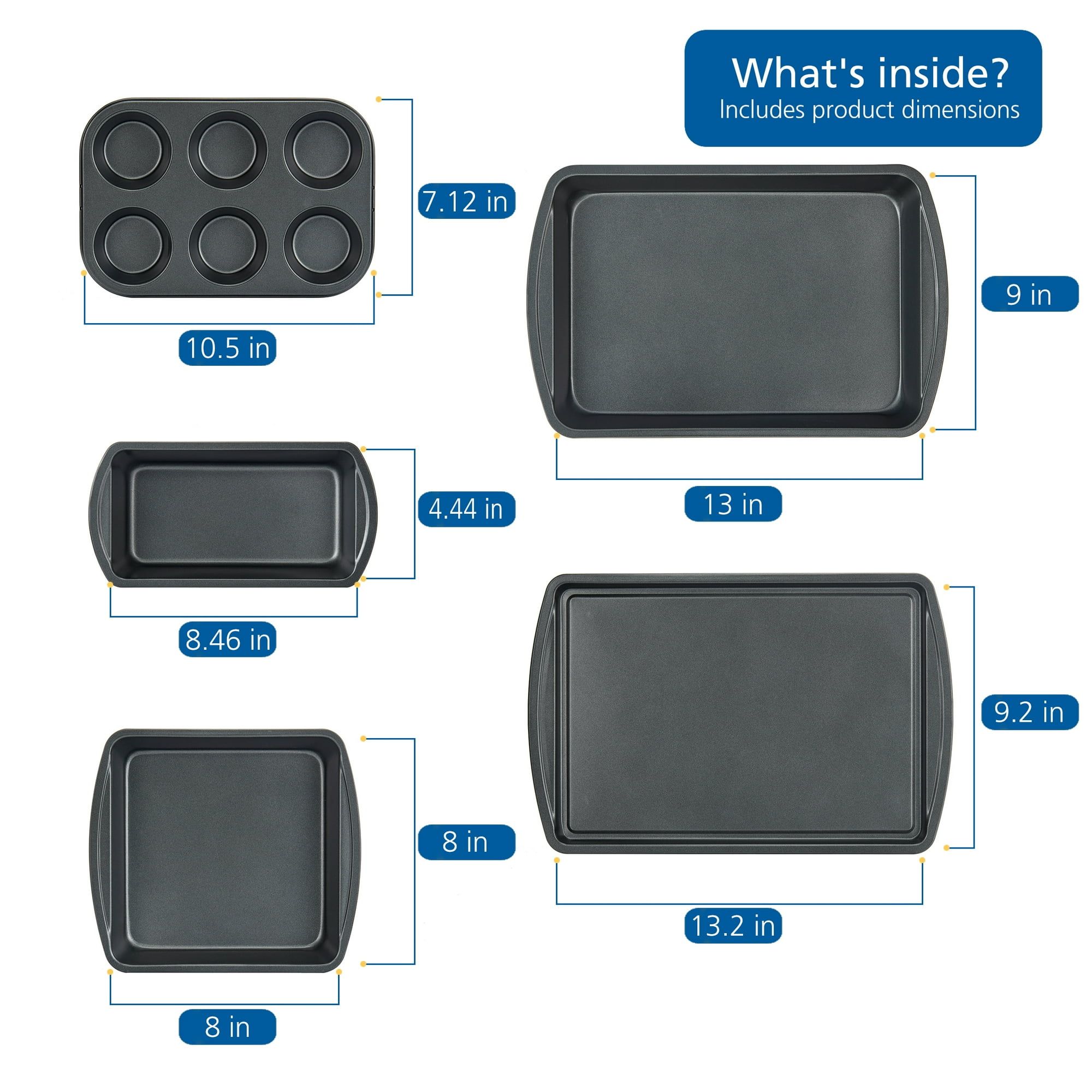This sturdy Mainstays 6pc bakeware set features all the necessary equipment for making your favorite desserts, cookie, breads and much more. Made of reliable carbon steel, excellent heat transfer. Includes: one square pan, one roster pan, one cookie sheet, one 6-cup muffin pan and two loaf pan. So all of your baking needs are met. Non-stick coating for easy food release and effortless cleaning. Before first use and after wash use, wash pan thoroughly with mild dishwashing detergent and warm water. All of these pans nest together for convenient storage after use. This good starting over set is a wonderful present for a housewarming shower.
