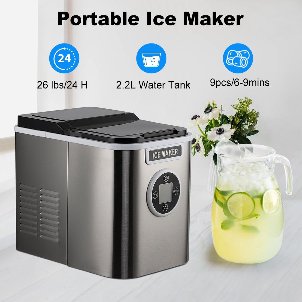 • This ice maker countertop has been upgraded with a new compressor, enabling it to produce 9 ice cubes in just 6 minutes and generate up to 26.5 lbs of ice per day. The ice machine maker offers three sizes of ice to choose from. The popular bullet-shaped cubes are smooth, won't stick together easily, and are perfect for whiskey, cold drinks, or iced coffee.