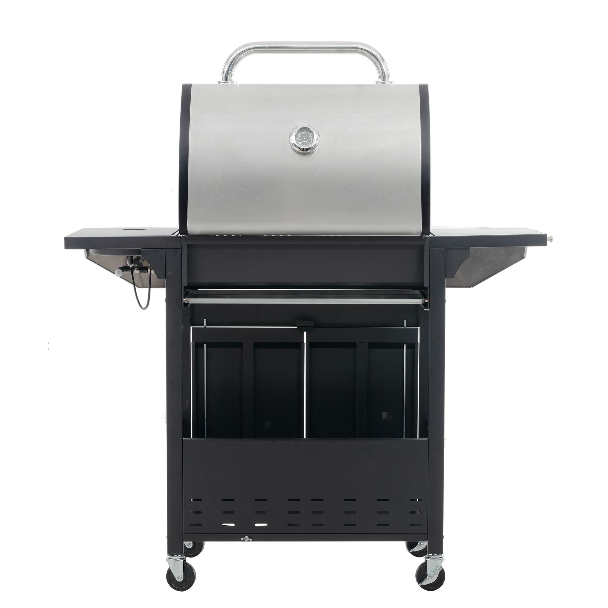 Each head can be independently fired, reliable side plate strength, stainless steel high temperature cover, side black powder, galvanized lining, cover with thermometer (round), stainless steel control panel, black body spray high temperature resistance 400, Fast & Even Heat: reliable enough to fire up burners immediately. with four wheels (two directional wheels, two steering wheels)
