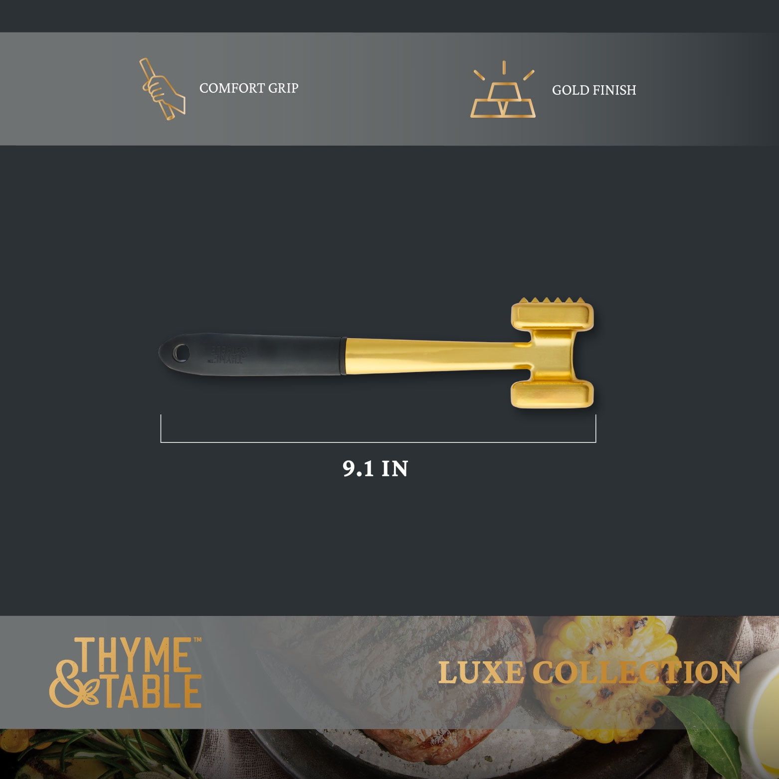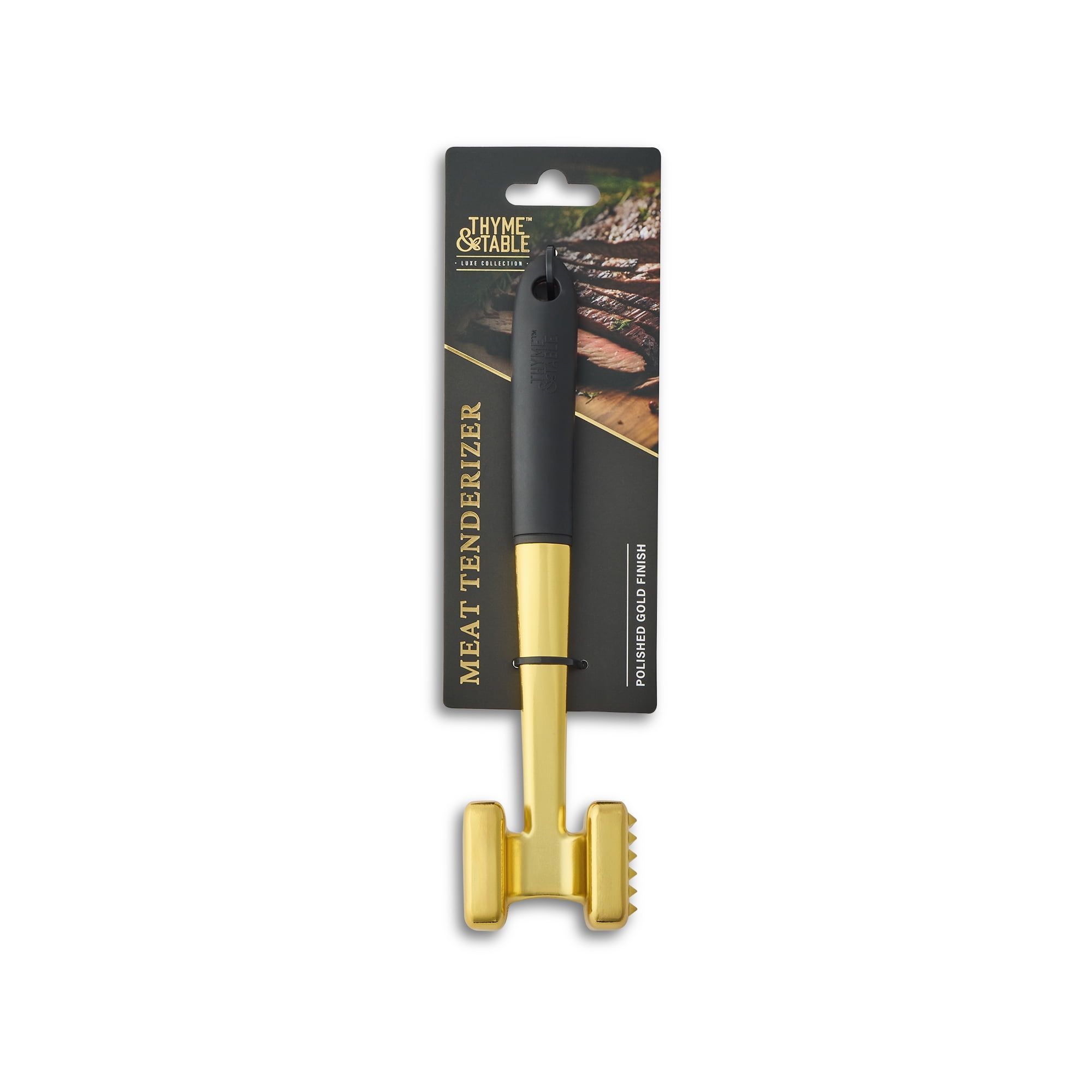 Introducing the Thyme & Table Meat Tenderizer in Polished Gold, a must-have tool for perfectly tender and flavorful meat. Featuring a dual-sided design, it's perfect for preparing chicken, pork, or beef with ease. The polished gold finish adds elegance to your kitchen, while the soft-grip handle ensures comfort, control, and effortless use. Elevate your cooking with this stylish and versatile tool.